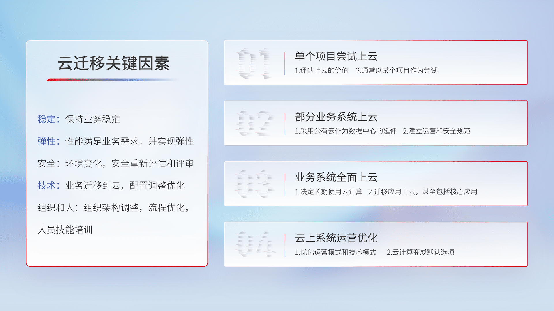 结合实际业务,,从规划设计、、、、云平台选型、、、、云原生改造、、、数据迁移、、、、集成交付,,,,迁移全过程为客户识别最佳上云路径,,做好风险识别管理,,,,设计网络架构、、身份权限、、安全审计合规、、、、操作审计、、日志审计、、、监控告警策略、、、多站点容灾设计等,,对云上基础设施进行整体规划,,,,提升IT治理水平,,,,以满足弹性、、、高可用、、高性能的需求。。。