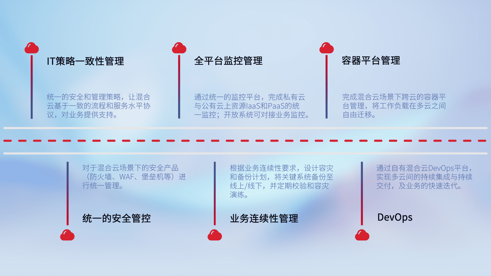 通过多云纳管,,,,以统一的资源数据模型把客户的云资源进行抽象和封装,,,,进而实现对多云资源的统一操作,,,保障云资源管理的可靠性、、、稳定性与可用性。。。。量身定制化运维内容,,配置、、、、开发运维、、补丁管理、、、、备份、、监控、、认证和访问管理、、、、审计和日常巡检等,,,,保障在用云过程中的可靠度,,稳定度以及高可用率。。。