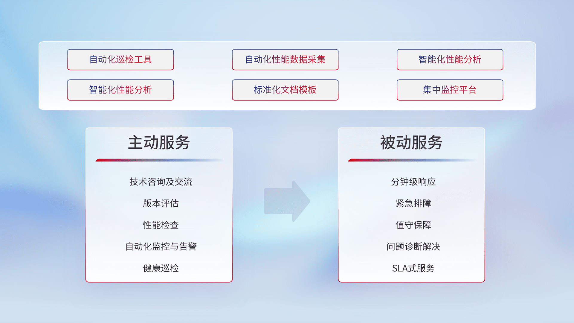 智能化工具和标准化文档,,,保障服务质量,,,提供主动服务(包含技术咨询、、、版本评估、、、性能检查、、、、自动化监控与告警、、、、健康巡检)和被动服务包含(分钟级响应、、紧急排障、、值守保障、、、问题诊断解决、、SLA服务)。。。